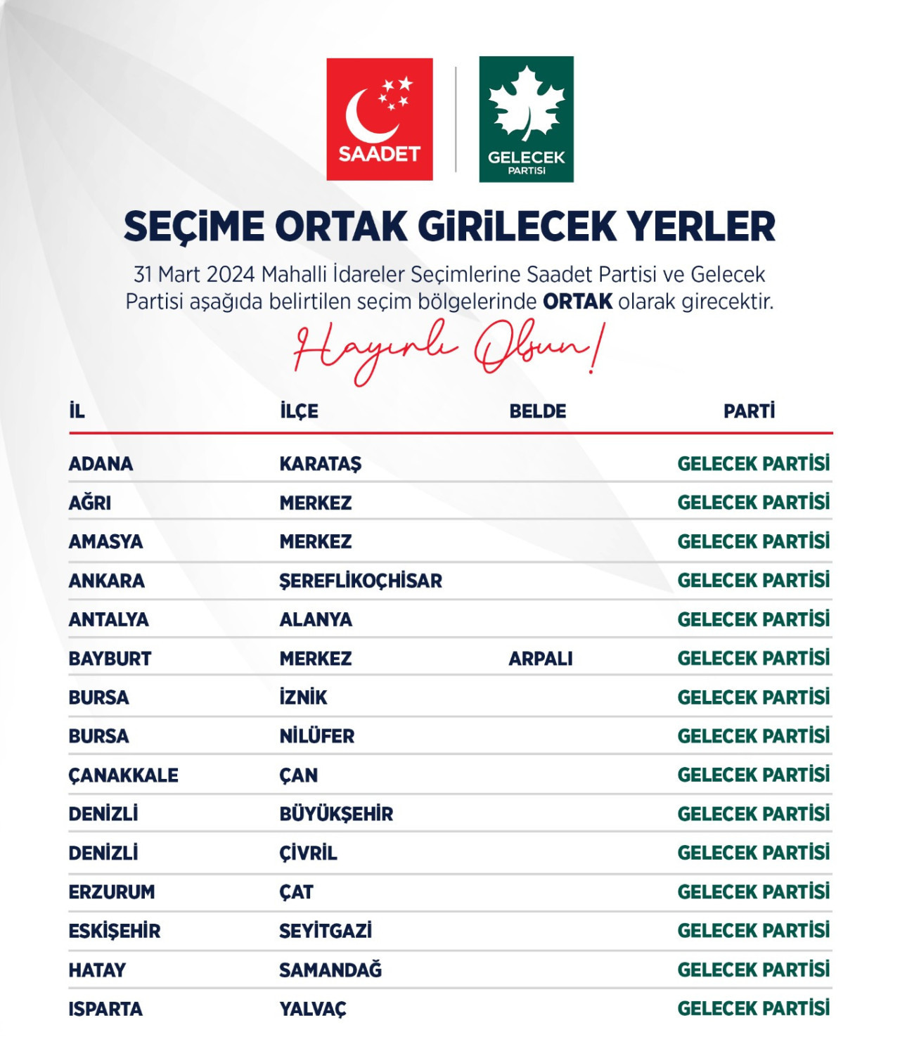 Ankara'nın Şereflikoçhisar ilçesinde Gelecek Partisi, Bala ve Gölbaş ilçelerinde Saadet Partisi adayı desteklenecek. Listede İzmir ve İstanbul'da ortak aday bulunmuyor.