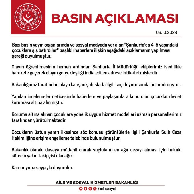 Bakanlığın sosyal medya hesabından yapılan açıklamada, bazı basın yayın organlarında ve sosyal medyada yer alan 'Şanlıurfa'da 4-5 yaşındaki çocuklara şiş batırdılar' başlıklı haberlere ilişkin açıklama yapılmasına gerek duyulduğu belirtilerek, "Olayın öğrenilmesinin hemen ardından Şanlıurfa İl Müdürlüğü ekiplerimiz ivedilikle harekete geçerek olayın gerçekleştiği iddia edilen adrese intikal etmişlerdir. Bakanlığımız tarafından olaya karışan şahıslarla ilgili suç duyurusunda bulunulmuştur. Yapılan incelemeler neticesinde haberlere ve paylaşımlara konu olan çocuklar devlet koruması altına alınmıştır. Koruma altına alınan çocuklara yönelik uygun hizmet modelleri uzman personellerimiz tarafından yürütülmektedir. Çocukların üstün yararı ilkesince söz konusu görüntülerle ilgili Şanlıurfa Sulh Ceza Hakimliğine erişim engelleme talebinde bulunulmuştur. Bakanlık olarak davaya müdahil olarak suçluların en ağır cezayı alması için hukuki sürecin yakın takipçisi olacağız" denildi. (DHA)