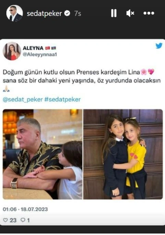 Aleyna isimli kullanıcı paylaşımında, “Doğum günün kutlu olsun prenses kardeşim Lina. Sana söz bir dahaki yeni yaşında, öz yurdunda olacaksın” ifadelerini kullanarak Sedat Peker’i etiketledi.