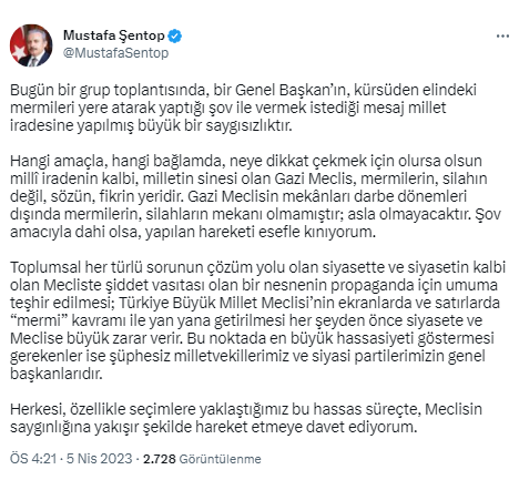 Hangi amaçla, hangi bağlamda, neye dikkat çekmek için olursa olsun millî iradenin kalbi, milletin sinesi olan Gazi Meclis, mermilerin, silahın değil, sözün, fikrin yeridir. Gazi Meclisin mekânları darbe dönemleri dışında mermilerin, silahların mekanı olmamıştır; asla olmayacaktır. Şov amacıyla dahi olsa, yapılan hareketi esefle kınıyorum.