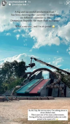 Subaşı, "Büyük ve başarılı bir yapım ekibi! 6 farklı ülke için 'survivor' TV şovunu çekiyor. 13 yıldan fazladır Dominik Cumhuriyeti! Ne büyük başarı, çok gurur duyuyorum. Bu arada bahsettiğim başarı hikayesi Melisa'nın babası hakkında. Bu, onun pek çok başarısından sadece biri. Başardıklarını görmek beni çok gururlandırıyor" sözlerini paylaştı.