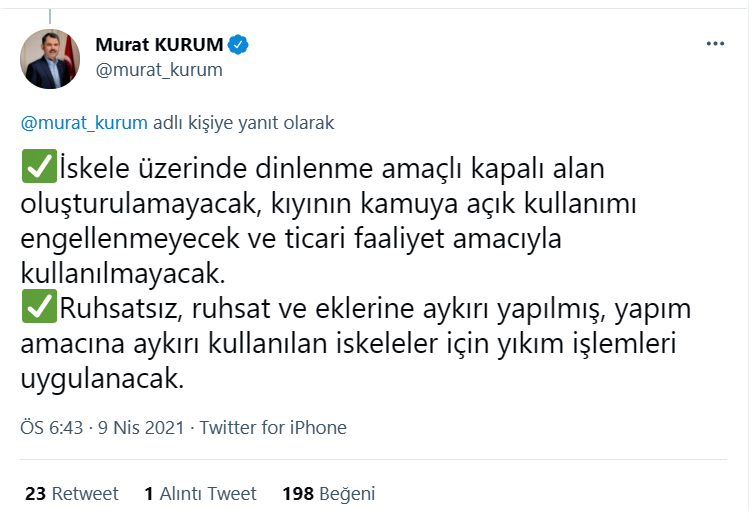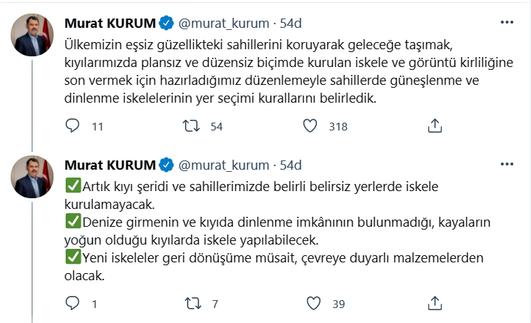 “Ülkemizin eşsiz güzellikteki sahillerini koruyarak geleceğe taşımak, kıyılarımızda plansız ve düzensiz biçimde kurulan iskele ve görüntü kirliliğine son vermek için hazırladığımız düzenlemeyle sahillerde güneşlenme ve dinlenme iskelelerinin yer seçimi kurallarını belirledik. Artık kıyı şeridi ve sahillerimizde belirli belirsiz yerlerde iskele kurulamayacak