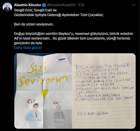 “Sevgili Emir, Sevgili Esin ve Gözlerindeki Işıltıyla Geleceği Aydınlatan Tüm Çocuklar; Ben de sizleri seviyorum. Doğup büyüdüğüm semtim Beykoz’u, masmavi gökyüzünü, biricik evladım Ali’yi nasıl seviyorsam… Bu güzel ülkenin tüm çocuklarını, yüreği tertemiz gençlerini de öyle seviyorum. Ulu Önder Mustafa Kemal Atatürk’ün de işaret ettiği gibi "Çocukları sevmek, vatanı sevmek demektir." Onlar, bu ülkenin yarınlarını inşa ediyor. Silivri zindanlarına umut yollayan evlatlarımız; adil, özgür bir geleceği ve her şeyin en güzelini hak ediyor. Bu bayram ayrı düşsek de kalbim sizlerle atıyor. Her birinizin gözlerinden öpüyor, 23 Nisan Ulusal Egemenlik ve Çocuk Bayramınızı kutluyorum. Alaattin Köseler. Beykoz’un Seçilmiş Belediye Başkanı. Nisan 2025 / Silivri”