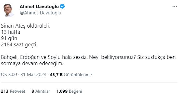 Gelecek Partisi Genel Başkanı Ahmet Davutoğlu, her hafta cuma günü sosyal medya hesabından yaptığı paylaşımı bugün de tekrarladı, Bahçeli, Erdoğan ve Soylu'ya bir kez daha seslendi: Sinan Ateş öldürüleli, 13 hafta 91 gün 2184 saat geçti. Bahçeli, Erdoğan ve Soylu hala sessiz. Neyi bekliyorsunuz? Siz sustukça ben sormaya devam edeceğim