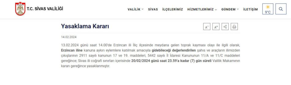 “13.02.2024 günü saat 14.00’de Erzincan ili İliç ilçesinde meydana gelen toprak kayması olayı ile ilgili olarak, Erzincan iline kanuna aykırı eylemlere katılmak amacıyla gidebileceği değerlendirilen şahıs ve araçların ilimizden çıkışlarının 2911 sayılı kanunun 17 ve 19. maddeleri, 5442 sayılı İl İdaresi Kanununun 11/A ve 11/C maddeleri gereğince; Sivas ili coğrafi sınırları içerisinde 20/02/2024 günü saat 23.59’a kadar (7) gün süreli Valilik Makamının kararı gereğince yasaklanmıştır.”