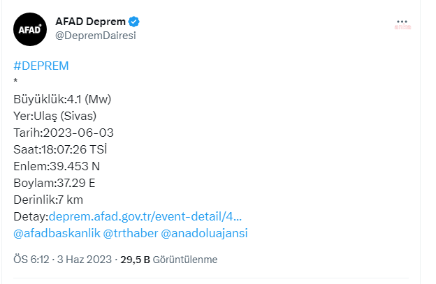 AFAD, Sivas’ın Ulaş ilçesinde saat 18.07’de 7 kilometre derinlikte, 4.1 büyüklüğünde deprem olduğunu açıkladı.AFAD, Sivas’ın Ulaş ilçesinde saat 18.07’de 7 kilometre derinlikte, 4.1 büyüklüğünde deprem olduğunu açıkladı.