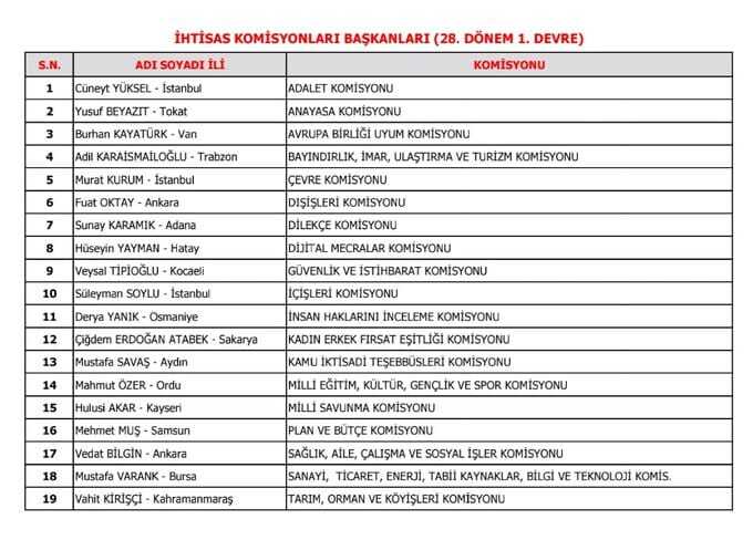 TBMM'den edinilen bilgiye göre 29. dönemde İhtisas Komisyonları Başkanlıkları'nda, Soylu, İçişleri Komisyonu Başkanı, Akar da Milli Savunma Komisyonu Başkanı olarak görev yapacak.