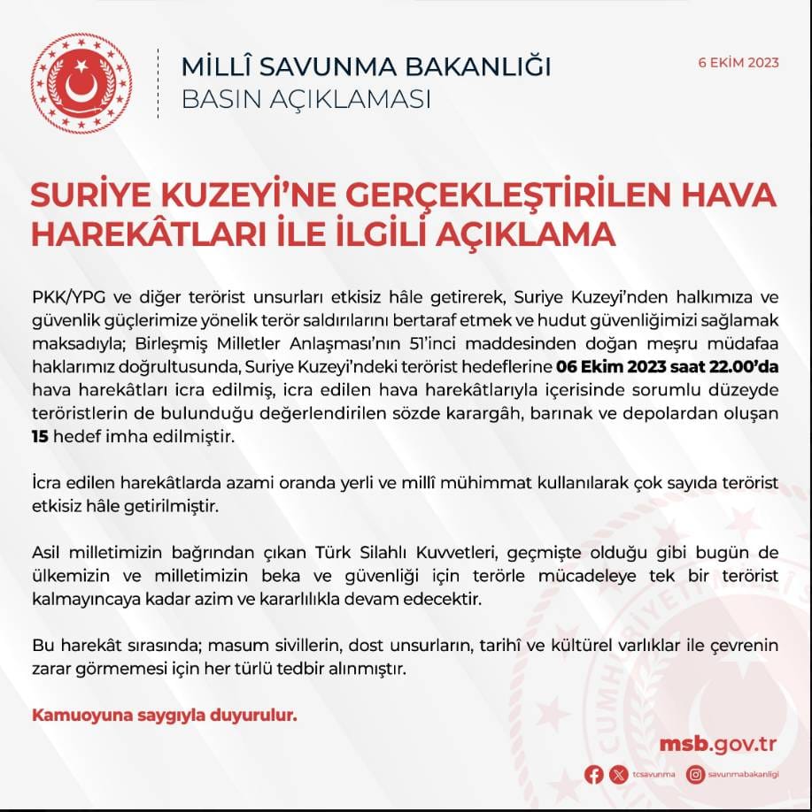 Milli Savunma Bakanlığı, "Sorumlu düzeyde teröristlerin de olduğu 15 hedef vuruldu" açıklamasını yaptı.