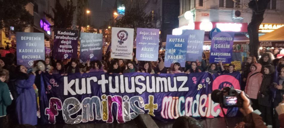 6 Şubat depremleri sonrasında bu düzenin nasıl işlediğini en ağır biçimde gördük. Evler yıkıldı, binalar yıkıldı, sokaklar, meydanlar yok oldu ama kadınların yaşamı yeniden kurma yükü ortadan kalkmadı. Ev yokken bile ev içi emek sömürüsü vardı. Günler, aylar boyunca kadınlardan yoklukta düzen yaratmaları, çocuklarına, kocalarına, hastalara, yaşlılara, engellilere bakmaları, su olmadan çamaşır, bulaşık yıkamaları beklendi. Şiddet uygulayan kocalarıyla, akrabalarıyla çadır ve konteyner paylaşmaya zorlandılar. Sağlığa, beslenmeye, güvenliğe, haklarına erişimleri olmadan bir seneyi doldurdular. “Bize oy vermezseniz işte böyle olur” lafını işittiler siyasetin en tepesinden. Biz kadınlar bu tehdidi, "bana itaat etmezsen dayağı hak edersin" diyen erkeklerden, "o saatte sokaktaysan, öyle giyindiysen, içki içtiysen tecavüzü hak edersin" diyen erkek medyadan, yargıdan, toplumdan iyi biliyoruz. Bir de bu yıkımın sorumlusu olan belediye başkanları, bakanlar hiç utanmadan yerel seçimde aday oldular. Yaşadıklarımızı unutturma, bizi tehditle susturma çabalarını kabul edecek olsak, buna karşı susacak olsak çoktan sinmiştik, hayattan silinmiştik. Ama tam tersine bugün feminizm her yerde, çünkü kurtuluşumuz feminizmde!