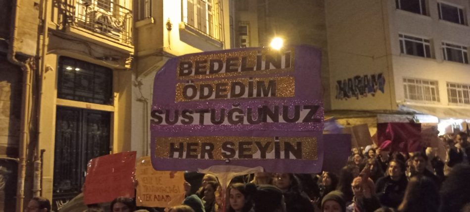 Bugün 8 Mart 2024. 22. Feminist Gece Yürüyüşü’ndeyiz. Sadece 22 yıldır değil, kendimizi bildiğimizden beri, yüzyıllardır mücadele vermiş, erkeklere direnmiş kadınlardan aldığımız güçle mücadele ediyoruz. Bu sene de başta patriyarkayla ve gücünü yine patriyarkadan alan siyasi baskılarla mücadele etmenin yolunu feminizmde, direnmenin gücünü feminist dayanışmada bulduk. Feminist mücadele bize sadece kadın ve lgbti+ düşmanlığıyla başa çıkma azmini değil, aynı zamanda her gün, her yerde dünyayı değiştirebileceğimize dair inancımızı verdi. Yalnızca bizler mücadele ettikçe, direndikçe artan iktidarın siyasi baskılarına karşı değil, hayatımızın her alanını ele geçirmeye, bedenlerimiz üstünde söz söylemeye, emeğimizi gasp etmeye, paramıza, malımıza, mülkümüze el koymaya, sırtımızdan geçinmeye, bizi sindirmeye, şiddetle kontrol edip cezalandırmaya çalışan erkeklere karşı her gün her an mücadele verdik. Bu erkekler kimi zaman sokakta tanımadığımız bir erkek, kimi zaman iş arkadaşımız, patronumuz, kimi zaman ve en çok da babamız, sevgilimiz kocamız oldular. Bizi sindirmek için, bizi bu eşitsiz sömürü düzenine mahkum etmek için yalnızca baskı ve şiddeti değil, aynı zamanda sevgi sözcüklerini kullanarak bizim için en iyisi olduğunu iddia ettikleri kendi kararlarına bizi iknaya çabaladılar. Şu yüzyılda, bugün burada bulunan on binlerce kadın, sırf geçtiğimiz 8 marttan bu yana binlerce defa hayatındaki erkeklere eşit olduklarını anlatmaya, kendi kararları ile diledikleri yaşamı sürme hakları olduğunu anlatmaya çalıştı. Bizim mücadelemizden, feminizmden korkuyorlar çünkü feminist dayanışmamız, birlikte ördüğümüz bu mücadele bizlere yalnız olmadığımızı hatırlatıyor. Kendimizi en çaresiz, alternatifsiz hissettiğimiz anlarda, bu hayatı değiştirme gücümüz olduğunu bizlere hatırlatıyor. Erkeklere hayır deme, bu düzene başkaldırma gücü veriyor.