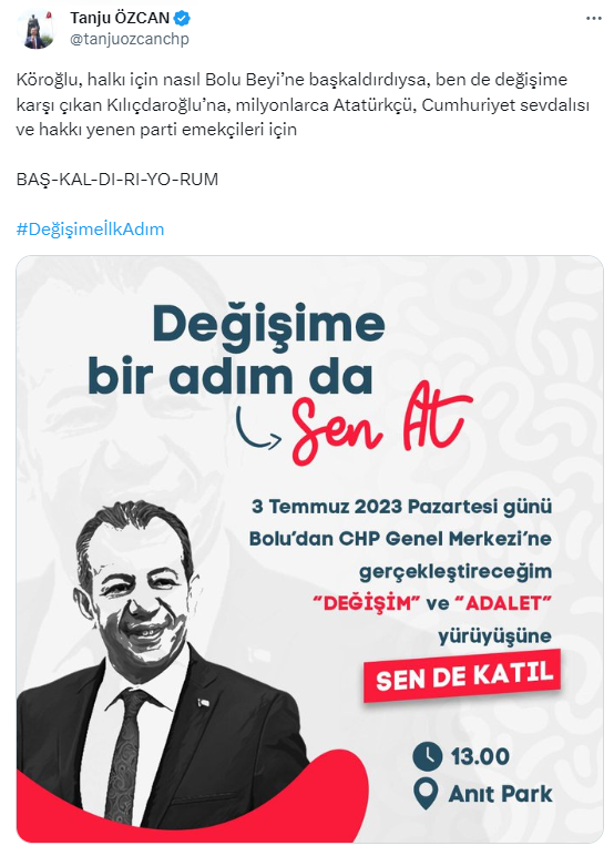 Tanju Özcan, 3 Temmuz Pazartesi günü Bolu'dan CHP Genel Merkezi'ne gerçekleştireceği ''Değişim'' ve ''Adalet'' yürüyüşüne tüm vatandaşları davet etti. Özcan paylaşımında şu ifadelere yer verdi: