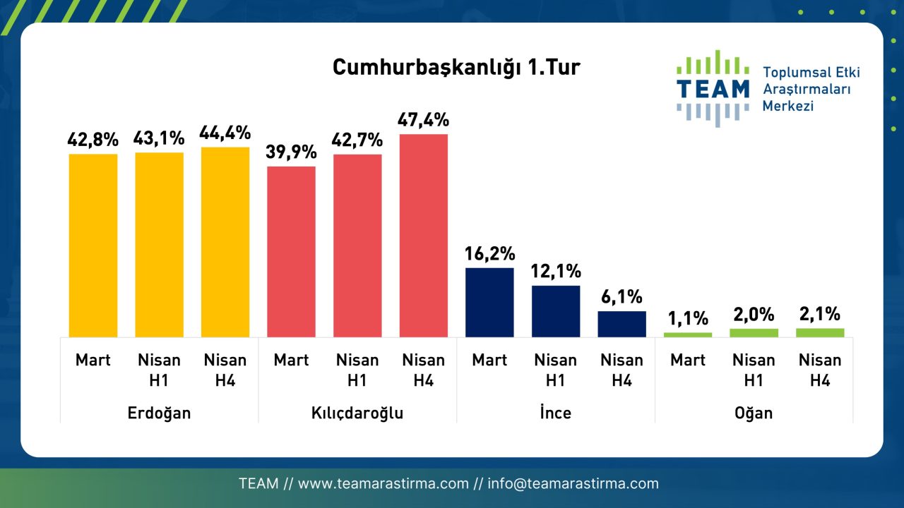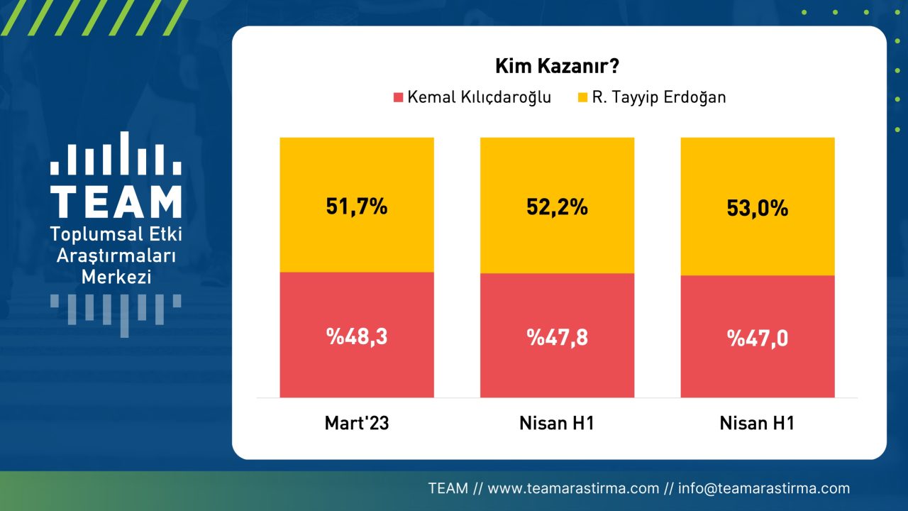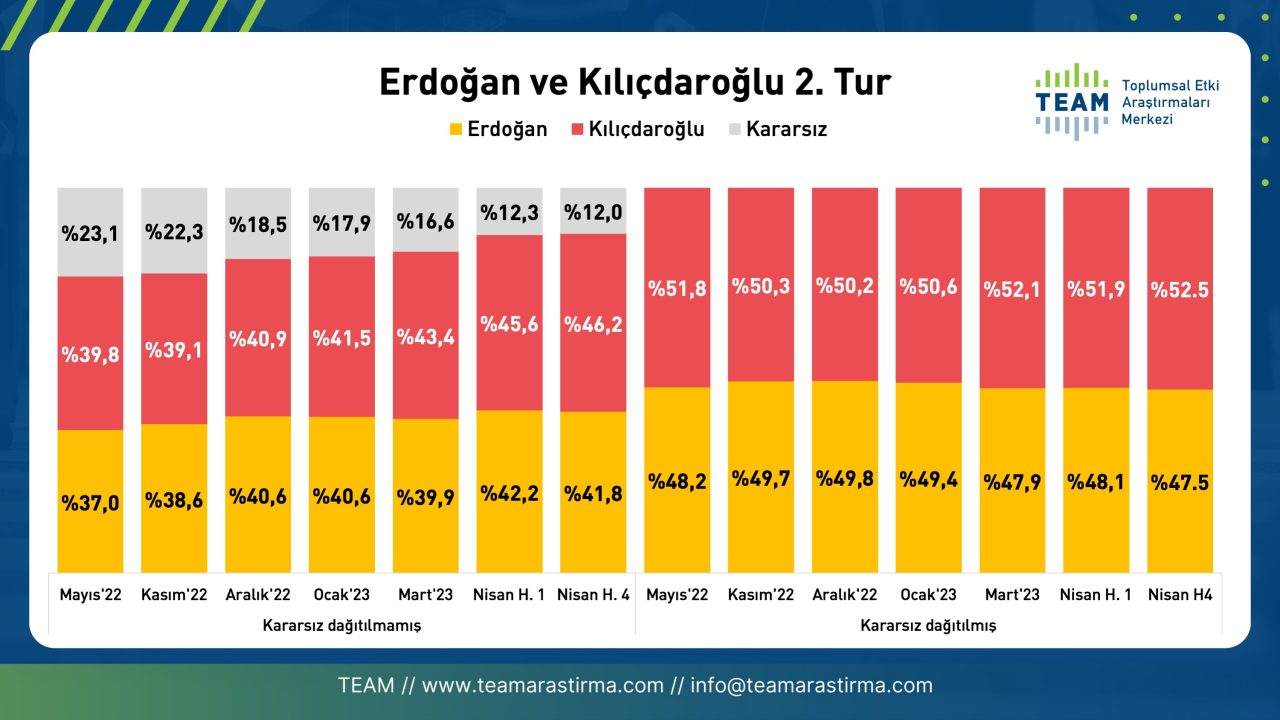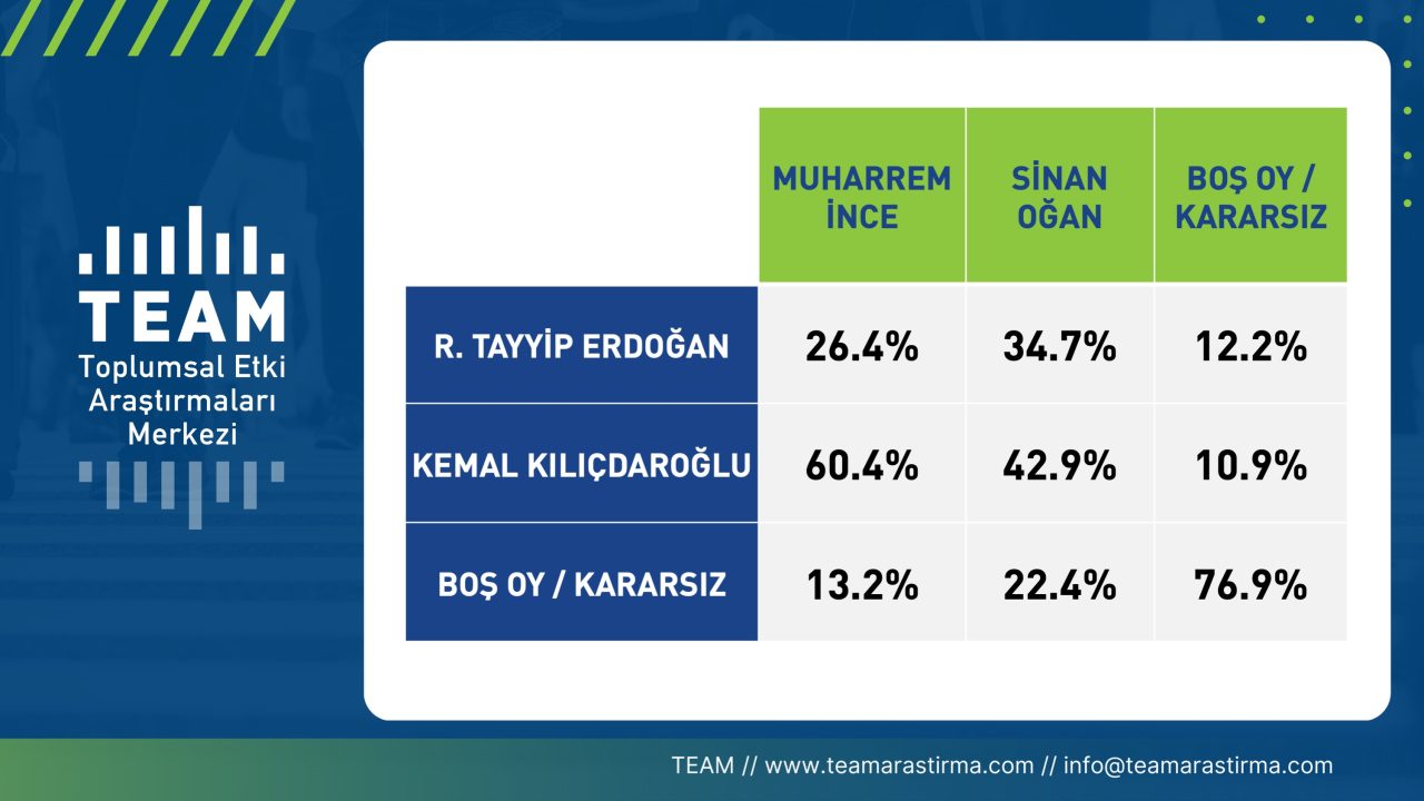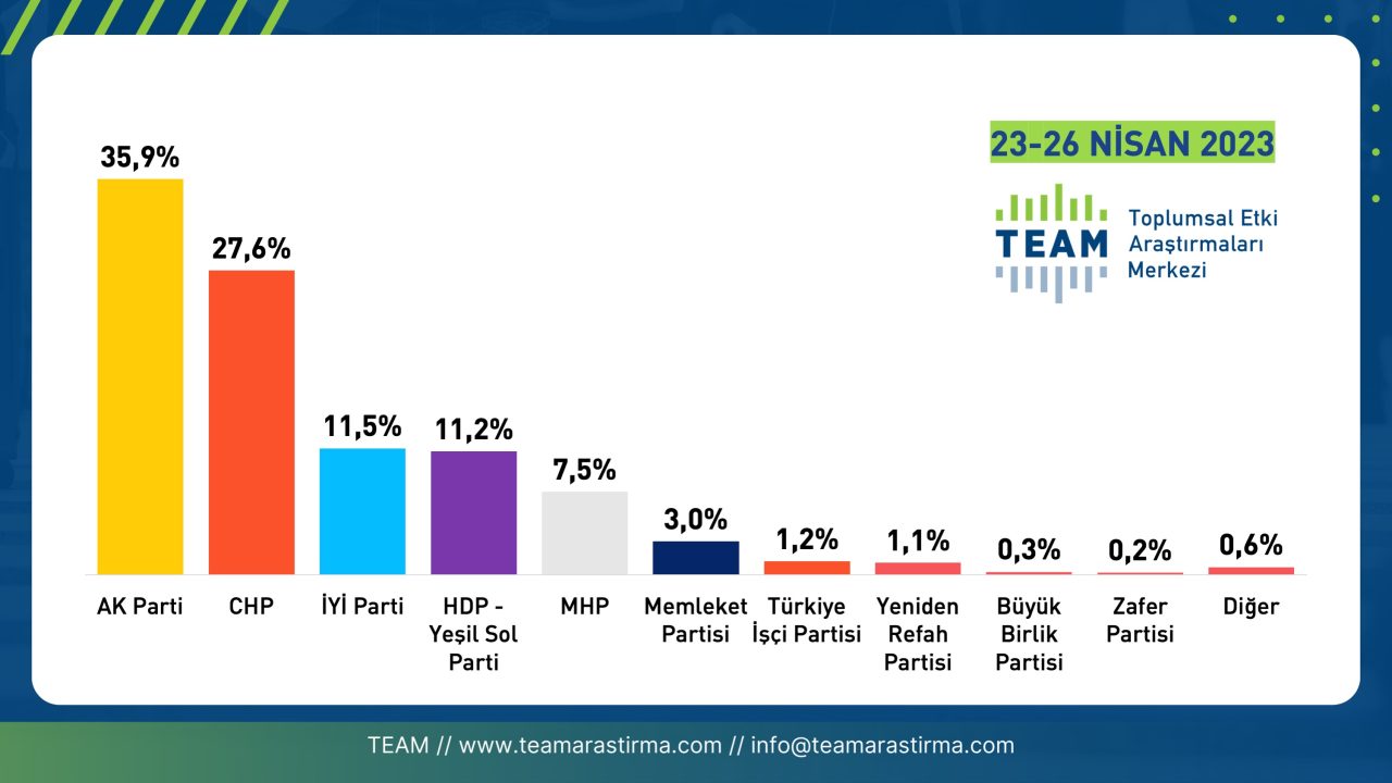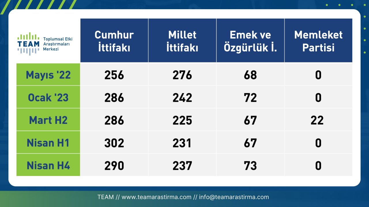 Toplumsal Etki Araştırmaları Merkezi (TEAM) 14 Mayıs 2023'teki seçimlere sayılı günler kala son anketini yayımladı. Araştırmada Muharrem İnce ve Memleket Partisi'nde mart ayında yükselen oyların kalıcı olmadığı görüldü. Cumhurbaşkanlığı seçiminin ikinci tura kaldığını ifade eden ankette Cumhur ittifakı'nın TBMM'de çoğunluğu sağlayamadı belirtildi.