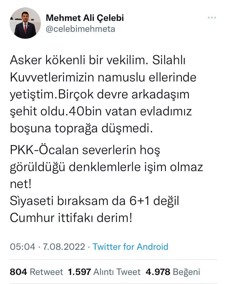 İktidar partilerinin üslubunu kullanan Çelebi, “Asker kökenli bir vekilim. Silahlı Kuvvetlerimizin namuslu ellerinde yetiştim. Birçok devre arkadaşım şehit oldu. 40 bin vatan evladımız boşuna toprağa düşmedi. PKK-Öcalan severlerin hoş görüldüğü denklemlerle işim olmaz net! Sìyaseti bıraksam da 6+1 değil Cumhur ittifakı derim!” ifadelerini kullandı.