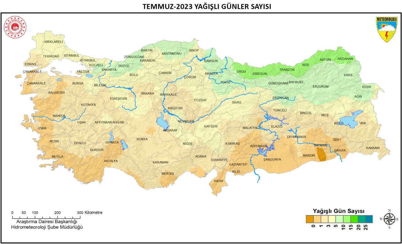 İl geneli yağışlarda en fazla yağış 187,5 mm ile Zonguldak, en az yağış alan il ise 0,1 mm ile Kilis oldu. Düzce ve Zonguldak'ta son 63 yılın en yüksek temmuz ayı yağışı kaydedildi. Normaline göre en fazla azalma gösteren il ise yüzde 97 ile Kilis oldu. Türkiye genelinde temmuz ayında ortalama 3,6 yağışlı gün görüldü (1991-2020 normali 3,2 gün). Yağışlı gün sayıları Doğu Karadeniz kıyı kesimi ile Ardahan çevrelerinde 10-15 gün aralığında, Kıyı Ege, Batı Akdeniz, Güneydoğu Anadolu Bölgesi, Çanakkale, Balıkesir, Isparta, Mersin ve Hatay çevrelerinde 1 güne kadar düştü.