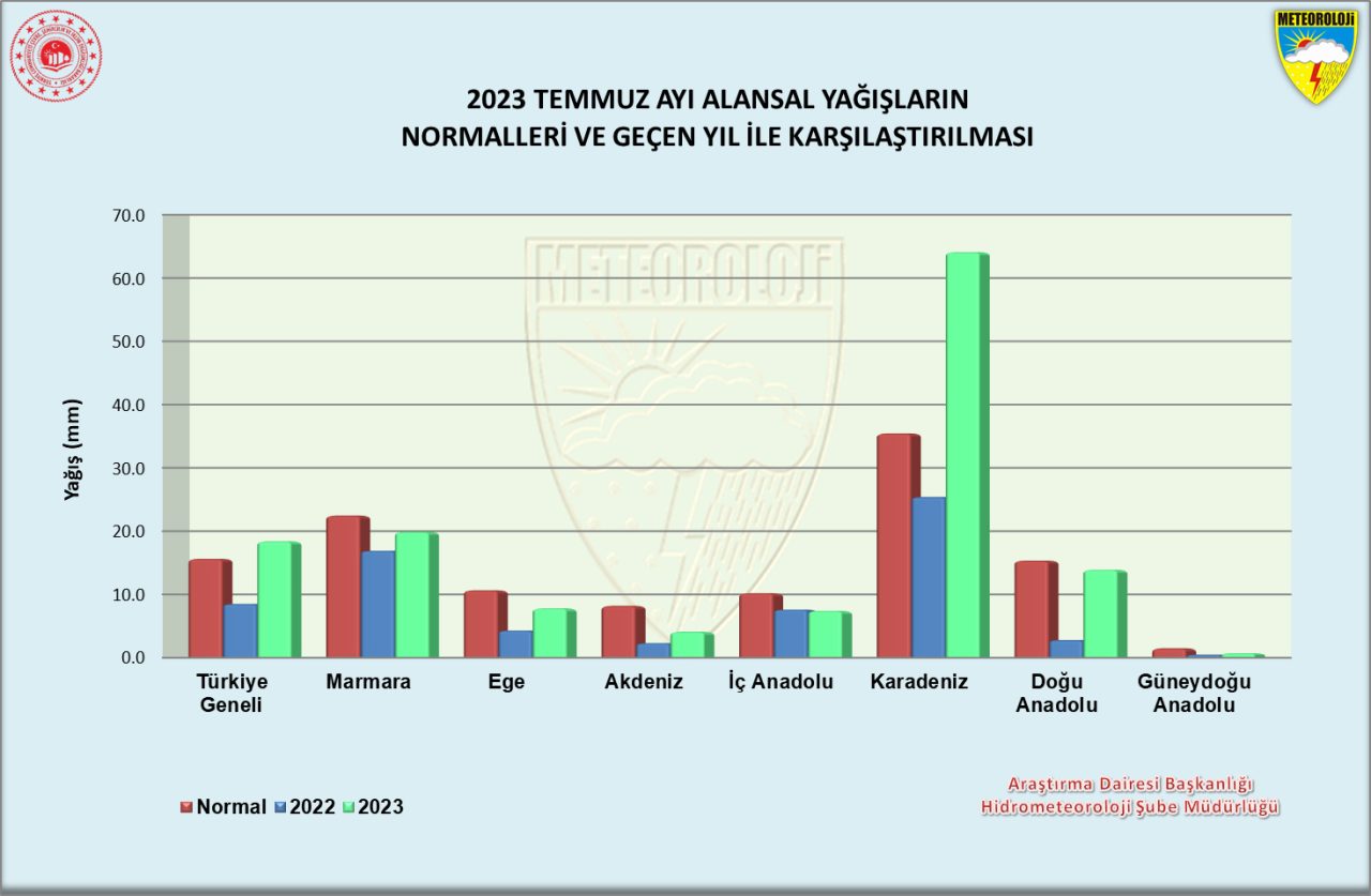 Meteoroloji'nin 2023 yılı Temmuz Ayı Alansal Yağış Raporu'na göre, Türkiye geneli temmuz ayı yağışları normalinin ve geçen yıl temmuz ayı yağışlarının üzerinde gerçekleşti. Raporda, temmuz ayında 18,4 mm olan yağış miktarının, (1991-2020) temmuz ayı normaline göre yüzde 18, geçen yıl temmuz ayı yağışlarına göre yüzde 100'den fazla artış gösterdiği belirtildi. Ancak bölge geneli yağışlarda, Karadeniz Bölgesi dışında tüm bölgelerde normaline göre azalma kaydedildiği açıklandı.