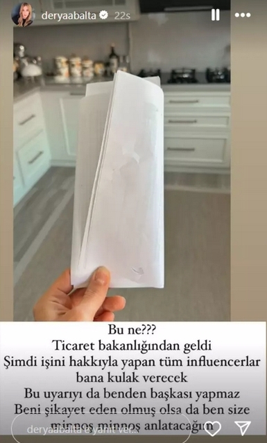 Emekli milli futbolcu Hakan Balta’nın eşi Derya Balta, bir sosyal medya paylaşımı yüzünden Ticaret Bakanlığı’na şikayet edildi. Instagram hesabında 457 bin takipçisi bulunan Derya Balta, Ticaret Bakanlığı’ndan gelen belgeyi takipçileriyle paylaştı ve cezayla ilgili açıklama yaptı.