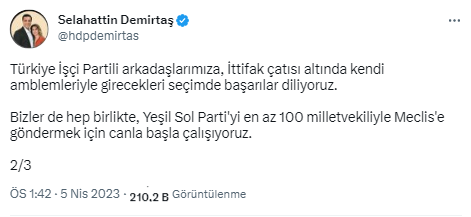 Türkiye İşçi Partili arkadaşlarımıza, İttifak çatısı altında kendi amblemleriyle girecekleri seçimde başarılar diliyoruz. Bizler de hep birlikte, Yeşil Sol Parti'yi en az 100 milletvekiliyle Meclis'e göndermek için canla başla çalışıyoruz.