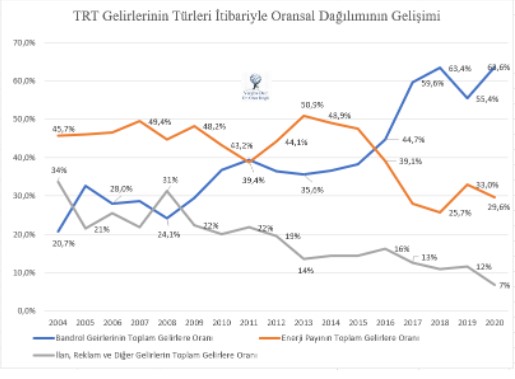 “Son 17 yıldaki gelirlerin yüzde 85'i bandrol gelirleri ile elektrik tüketimi üzerinden alınan TRT payı olarak da bilinen enerji payından oluşmaktadır” diyen Bingöl, 2020’ye gelindiğinde kurumun ilan ve reklam gelirlerinin bandrol gelirine oranının çok altına düştüğünü belirtti.