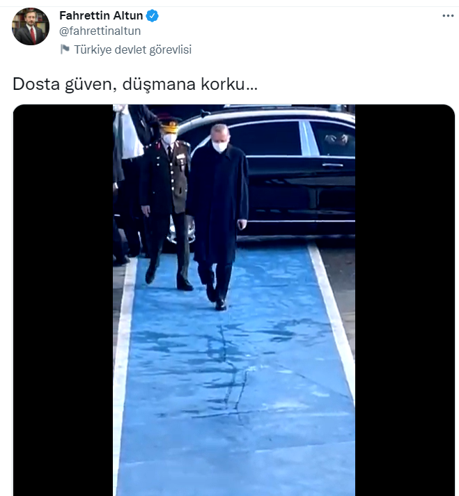 Twitter’da Cumhurbaşkanı Erdoğan’ın sağlık durumuna ilişkin olarak yapılan paylaşımlar üzerine Cumhurbaşkanlığı İletişim Başkanı Fahrettin Altun Cumhurbaşkanı Erdoğan’ın birkaç adım yürüdüğü bir videoyu paylaşarak “Dosta güven, düşmana korku…” paylaşımı yaptı.