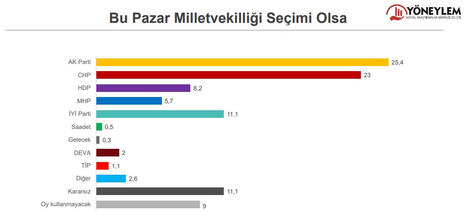 Katılımcılara “Bu Pazar Milletvekilliği Seçimi Olsa Kime Oy Verirsiniz?” sorusu yöneltildiğinde yüzde 25.4 AK Parti yanıtını verdi. Yüzde 23 ise CHP yanıtını verdi. Ankete göre HDP 8.2, MHP 5.7, İYİ Parti 11.1 oranında oy alıyor.