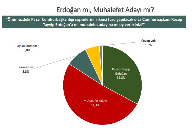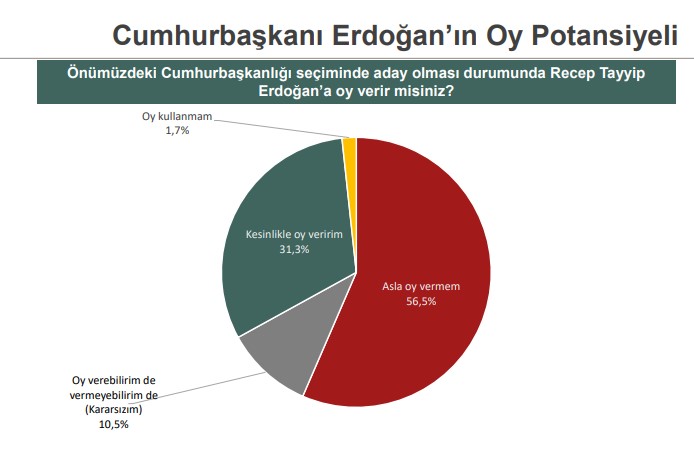 Cumhurbaşkanı Erdoğan’a ‘Asla oy vermem’ diyenlerin oranı ‘Kesinlikle oy veririm’, ‘Kararsızım’ ve ‘Oy kullanmayacağım’ diyenlerin toplamından daha fazla.