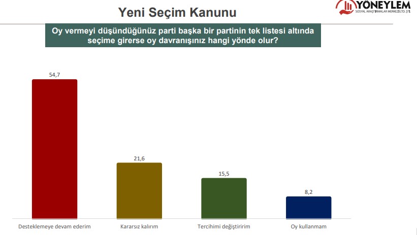 AK Parti ve MHP’nin hazırladığı seçim yasasıyla ittifaka katılan siyasi partilerin milletvekili hesaplama sistemini değişti. Bununla birlikte küçük partilerin ittifaktaki büyük partilerin listesinden seçime girmesi gündeme geldi. Katılımcılara bu durumda ne yapacakları soruldu.