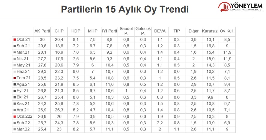 Yöneylem Sosyal Araştırmalar Merkezi, Nisan 2022 Türkiye Siyaset Paneli araştırmasının sonuçlarını paylaştı.