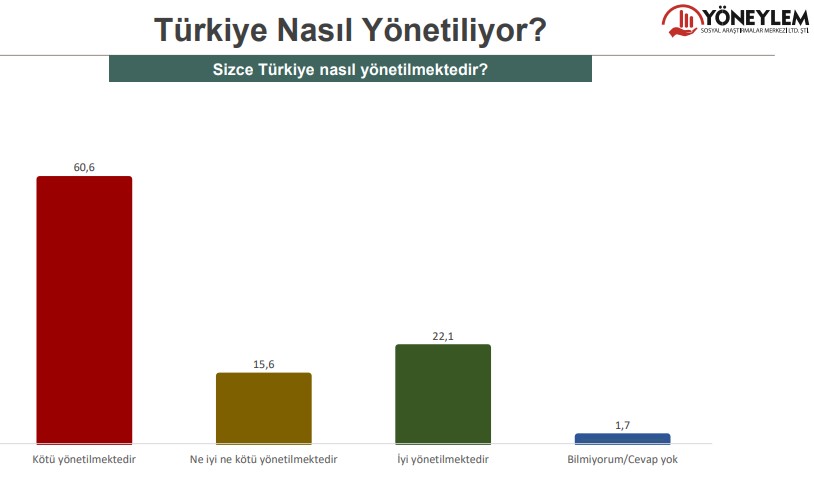 “Türkiye Nasıl Yönetiliyor?” sorusuna 10 katılımcıdan 6’sı ‘Kötü yönetiliyor’ yanıtını verdi