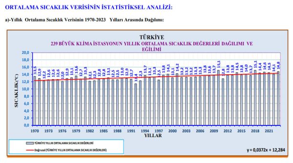 Meteoroloji Genel Müdürlüğü'nün 1970-2023 yılları arısındaki Türkiye Ortalama Sıcaklık raporunda, en sıcak ve en soğuk yıllardan, aylara göre en yüksek ve en düşük sıcaklıkların yaşandığı yıllar ile bölgelere ait veriler derlendi. Rapora göre, 2023 yılı, 53 yılın üçüncü en sıcak yılı oldu. 239 büyük klima istasyonunun yılık ortalama sıcaklık değerleri ortalamasına göre, Türkiye'de 2023 yılı ortalama sıcaklığı 14,8 derece ölçüldü.