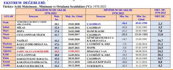 Meteoroloji Genel Müdürlüğü'nün 1970-2023 yılları ölçümlerine göre, 53 yılın sıcaklık rekoru 15 Ağustos 2023 günü 49,5 derece ile Eskişehir Sarıcakaya'da yaşanırken, en soğuk gün ise 9 Ocak 1990 günü Çaldıran'da eksi 46,4 derece olarak kayda geçti.