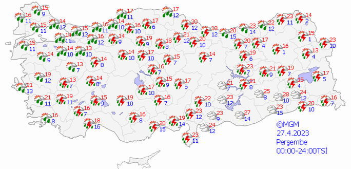 Bu gece saatlerinden itibaren Batı Akdeniz'de Antalya merkez ve doğusu, Burdur’un güneydoğusu ve Isparta'nın güneyinde kuvvetli yer yer çok kuvvetli (metrekareye 21-75 kilogram), yarın Batı Karadeniz Bölgesi, İç Ege (Afyonkarahisar, Denizli, Uşak ve Kütahya) ve İç Anadolu'da (Ankara, Konya, Aksaray, Kırşehir, Nevşehir, Kırıkkale, Yozgat) ve Adana'da yerel olarak kuvvetli (metrekareye 21-50 kilogram) sağanak ve gök gürültülü sağanak bekleniyor.