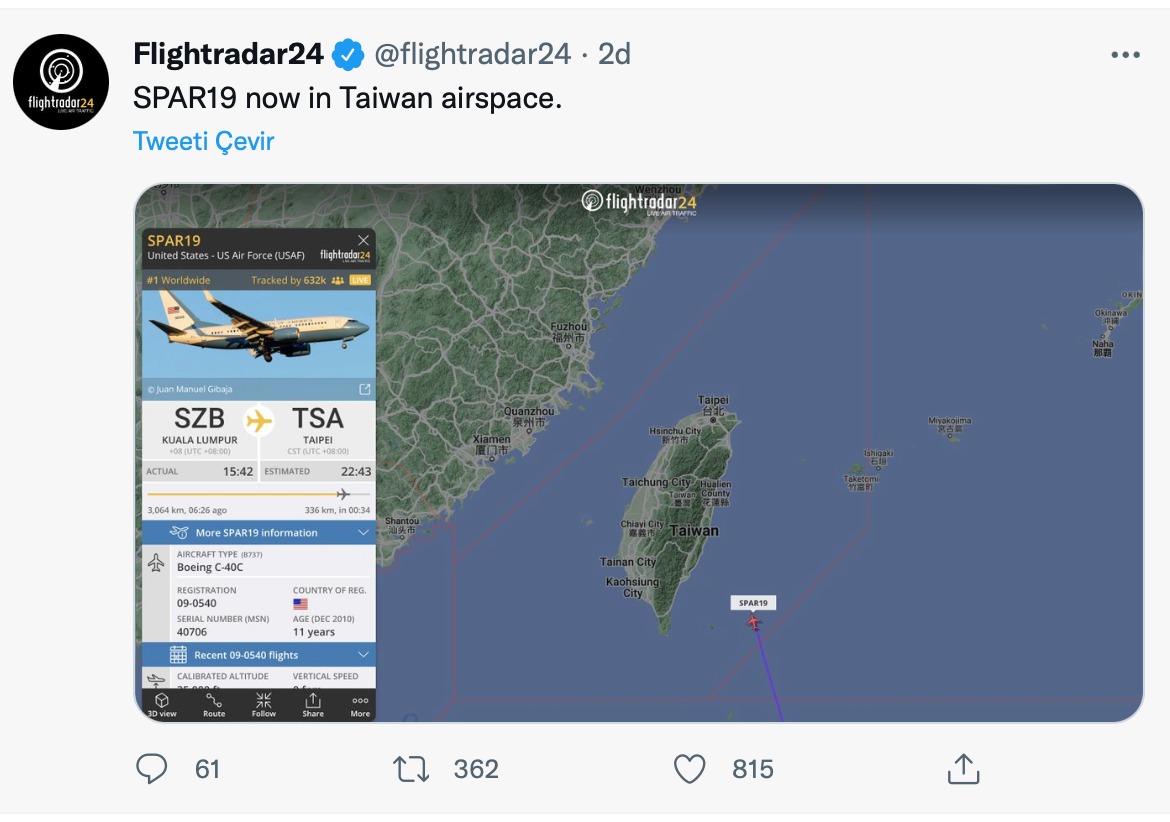 Uçuş takip sitesi Flight Radar 24, Nancy Pelosi’yi taşıyan SPAR19 isimli uçağın Tayvan hava sahasına girdiğini paylaştı. Pelosi’nin ziyareti resmi olarak açıklandıktan sonra Çin Hava Kuvvetleri’ne ait savaş uçakları Tayvan Boğazı’nın ortasındaki medyan çizgisine tam sınırda çok sayıda uçuş yapmaya başladı.