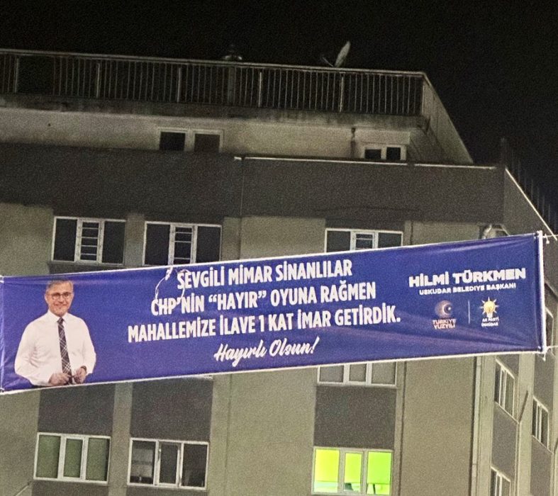 Tarihi ve manzarasıyla ünlü Üsküdar İlçesi'nin Belediye Başkan adayı Hilmi Türkmen'in asmış olduğu seçim pankartı tepkiyle karşılandı. Türkmen'in pankartında, "Sevgili Mimar Sinanlılar CHP'nin "hayır" oyuna rağmen mahallemize ilave 1 kat imar getirdik" yazdı.