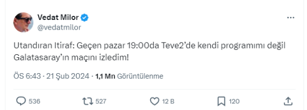 Yemek ve şarap eleştirmeni Vedat Milor, kendi programını izlemek yerine Galatasaray maçını izlediğini söyledi.