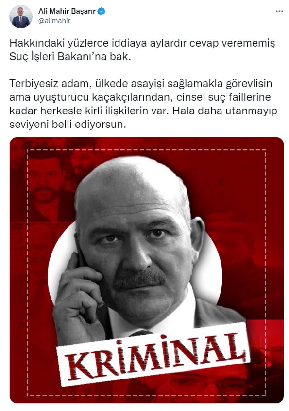 Kılıçdaroğlu’nu hedef alan Soylu’ya CHP Mersin Milletvekili Ali Mahir Başarır’dan sert yanıt geldi. Başarır, sosyal medya hesabından Soylu’nun üzerinde “Kriminal” yazan bir fotoğrafını paylaştı. Başarır notunda, “Hakkındaki yüzlerce iddiaya aylardır cevap verememiş suç işleri bakanına bak. Terbiyesiz adam, ülkede asayişi sağlamakla görevlisin ama uyuşturucu kaçakçılarından, cinsel suç faillerine kadar herkesle kirli ilişkilerin var. Hâlâ daha utanmayıp seviyeni belli ediyorsun” dedi.
