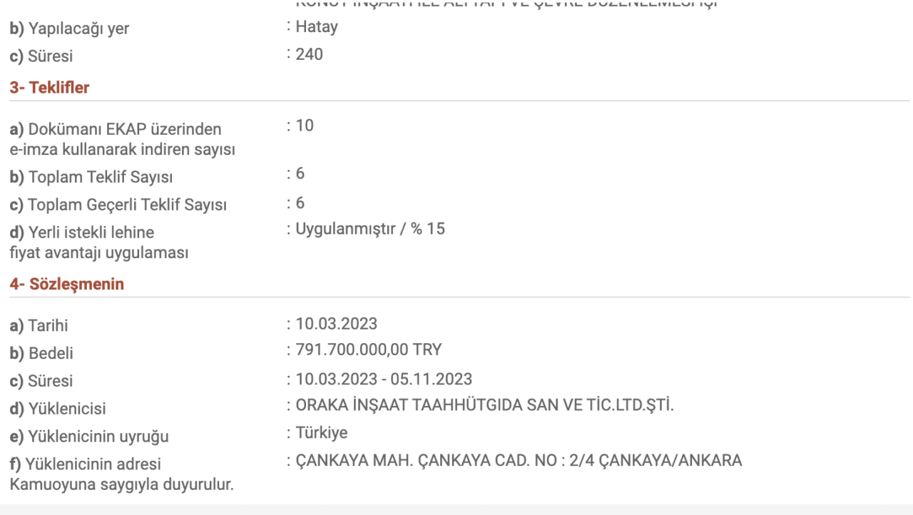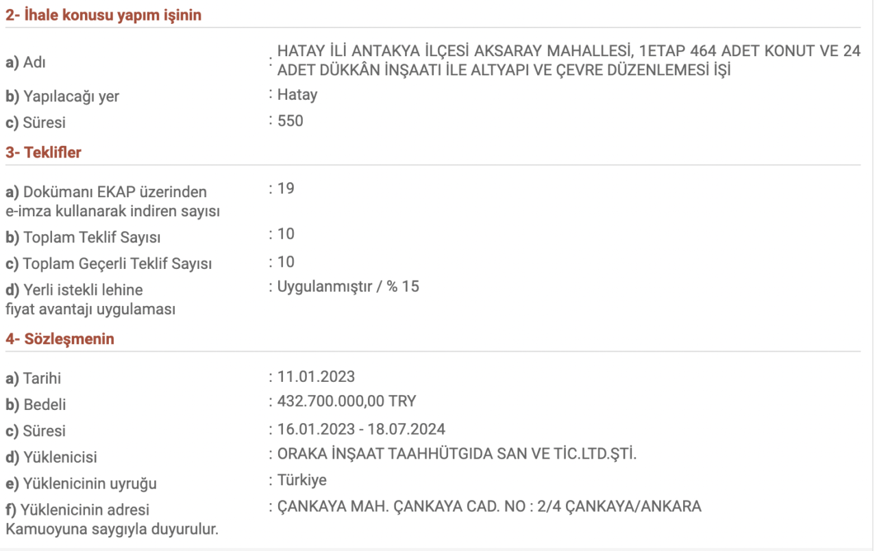 Deprem sonrası yapılan bu ihaleden önce Oraka İnşaat’ın Hatay’da bir başka yapım işini üstlendiği de Elektronik Kamu Alımları Platformu’ndaki ihale ilanlarında yapılan inceleme ile ortaya çıktı. Yine TOKİ tarafından açılan ihaleye 10 firma katıldı. Ancak ihaleyi 432 milyon 700 TL ile Oraka İnşaat üstlendi. Hatay’ın Antakya ilçesine bağlı Aksaray Mahallesi’nde 464 konut ve 24 adet dükkan inşaatı ile alt yapı ve çevre düzenlemesini kapsayan inşaat işi için şirket ile 11 Ocak 2023 tarihinde sözleşme yapıldı.