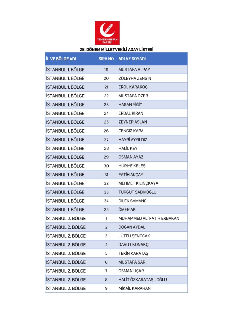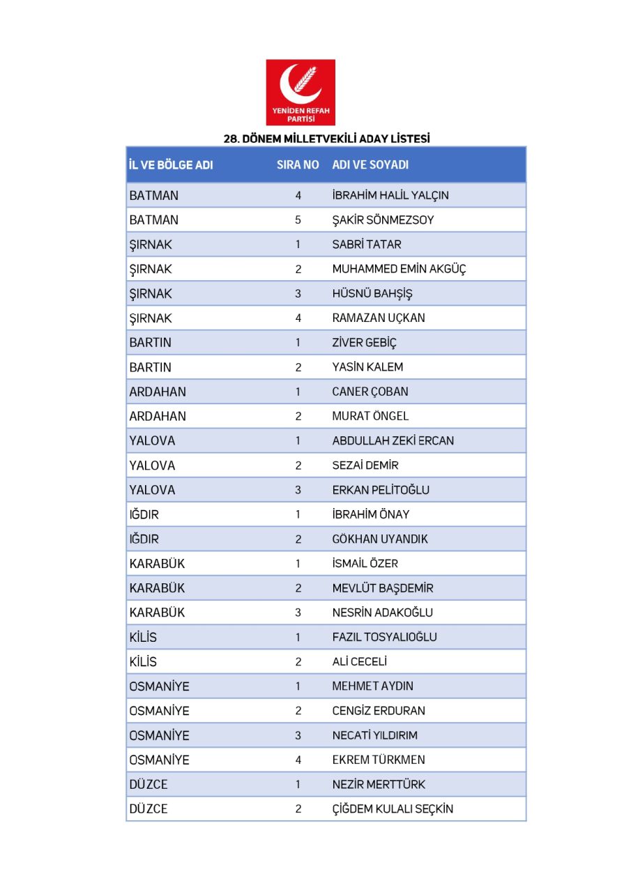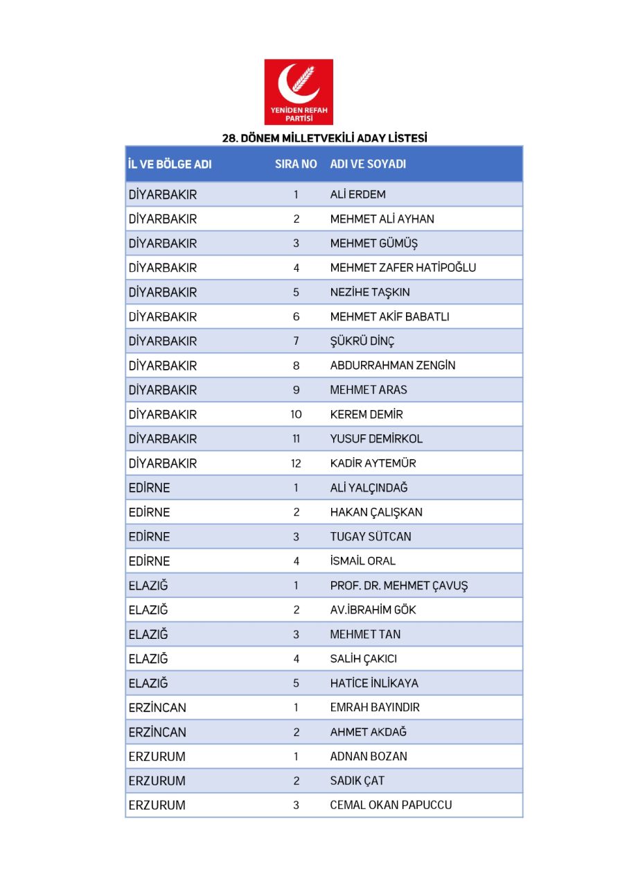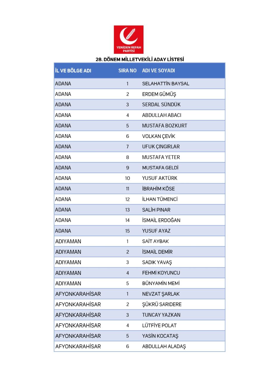 İşte Yeniden Refah Partisi'nin milletvekili adayları: