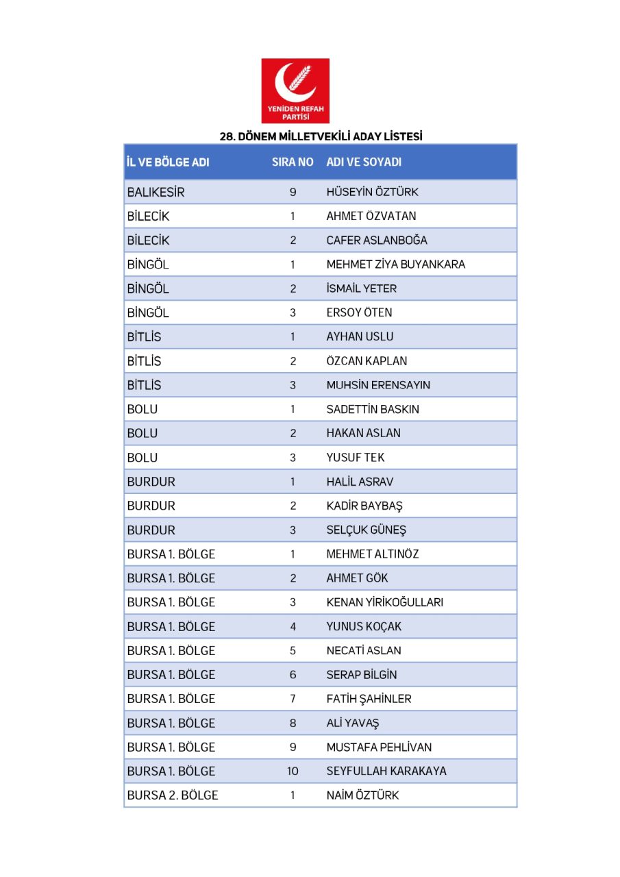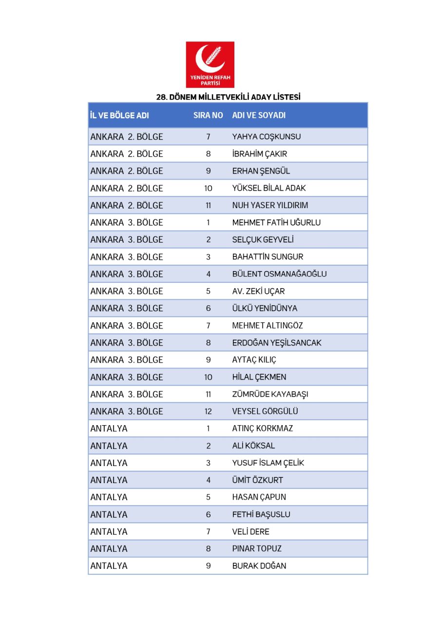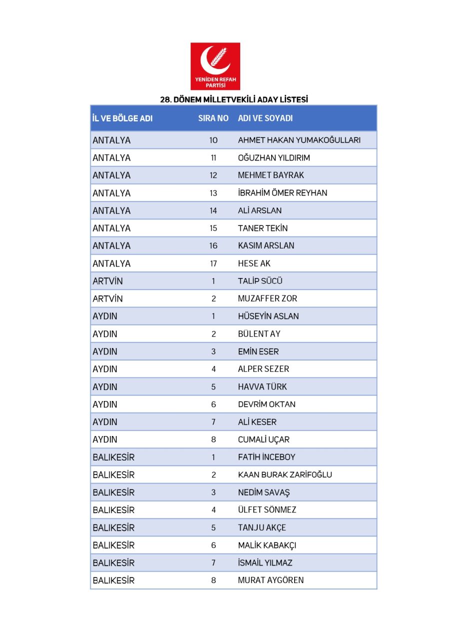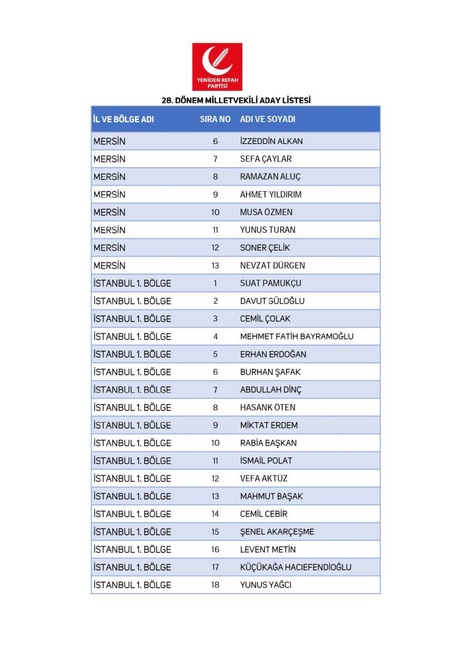 İşte Yeniden Refah Partisi'nin milletvekili adayları: