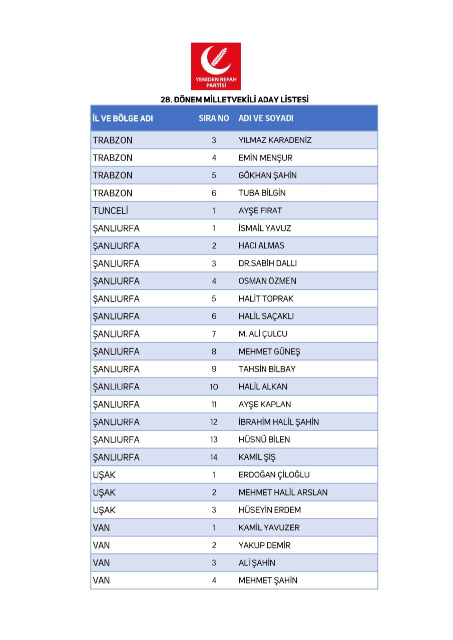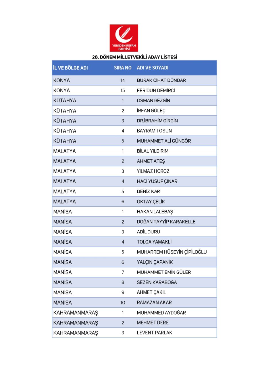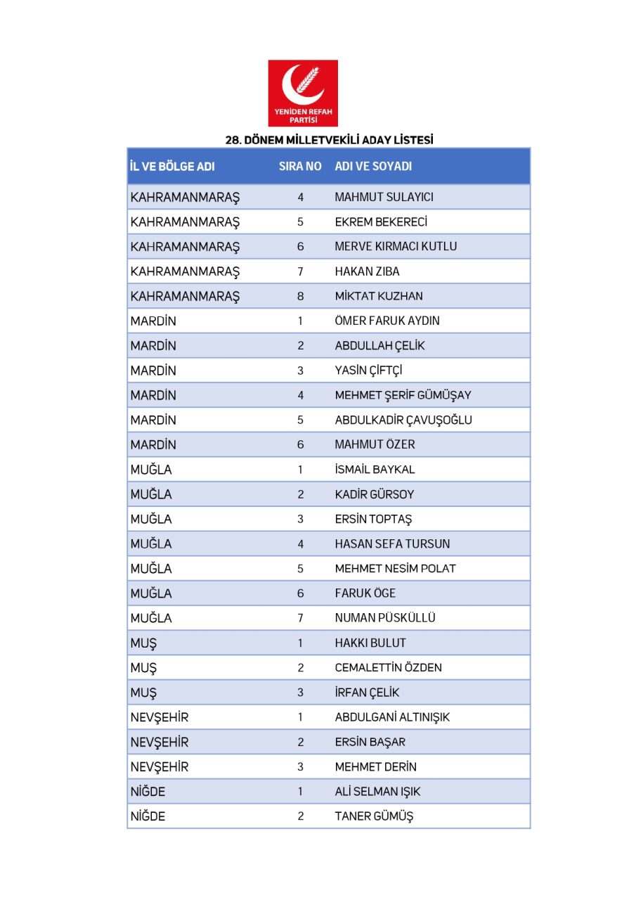Cumhur İttifakı'nda yer alan Yeniden Refah Partisi'nin 14 Mayıs'ta gerçekleşecek seçimlerdeki milletvekili adayları kesinleşti.