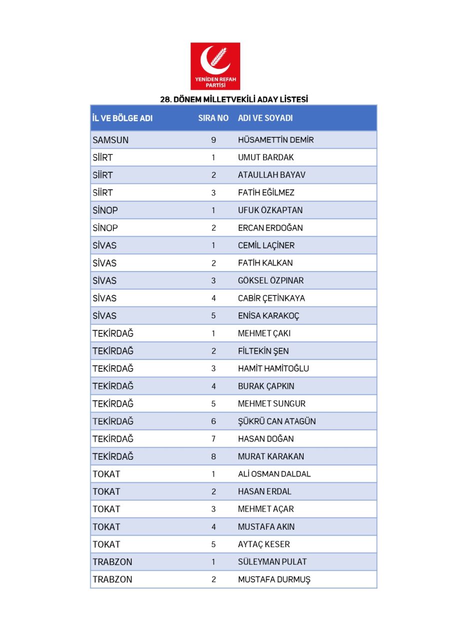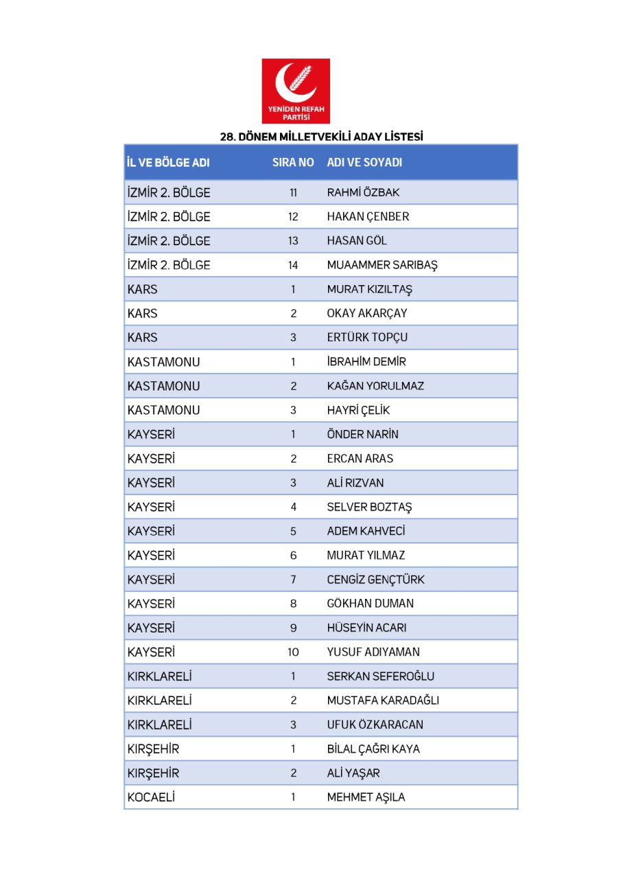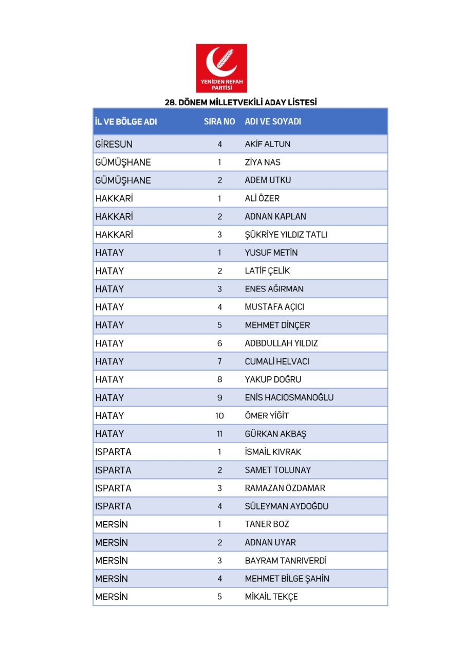 Cumhur İttifakı'nda yer alan Yeniden Refah Partisi'nin 14 Mayıs'ta gerçekleşecek seçimlerdeki milletvekili adayları kesinleşti.