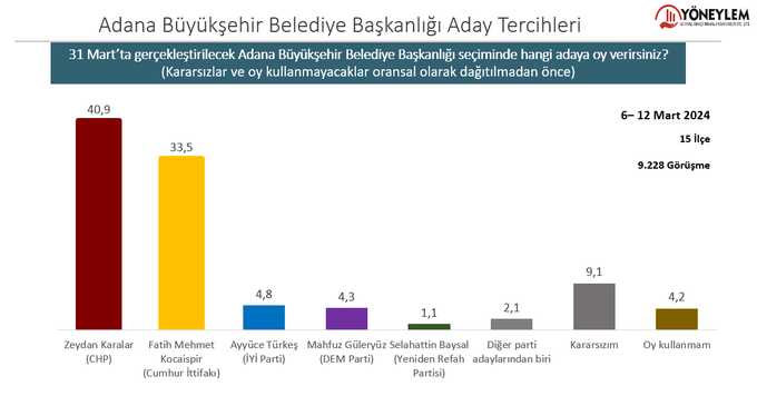 Yöneylem Araştırma Adana'da 9 bin 228 kişi ile yaptığı anket sonuçlarını paylaştı.