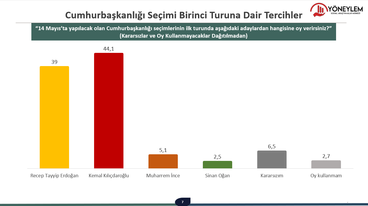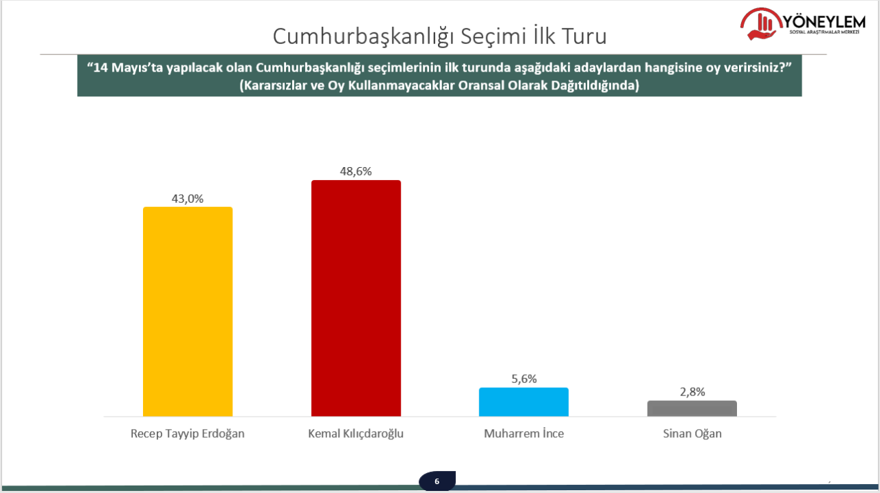 Yöneylem Sosyal Araştırma Şirketi, 14-16 Nisan tarihleri arasında gerçekleştirdiği son anketi açıkladı. Ankete göre Cumhurbaşkanlığı seçimi ikinci tura kalırken kararsızlar dağıtıldığında Kemal Kılıçdaroğlu, Tayyip Erdoğan’ın 5,6 puan önüne geçiyor. Ankete göre Kılıçdaroğlu’nun ilk turda yüzde 48,6 oy alıyor.