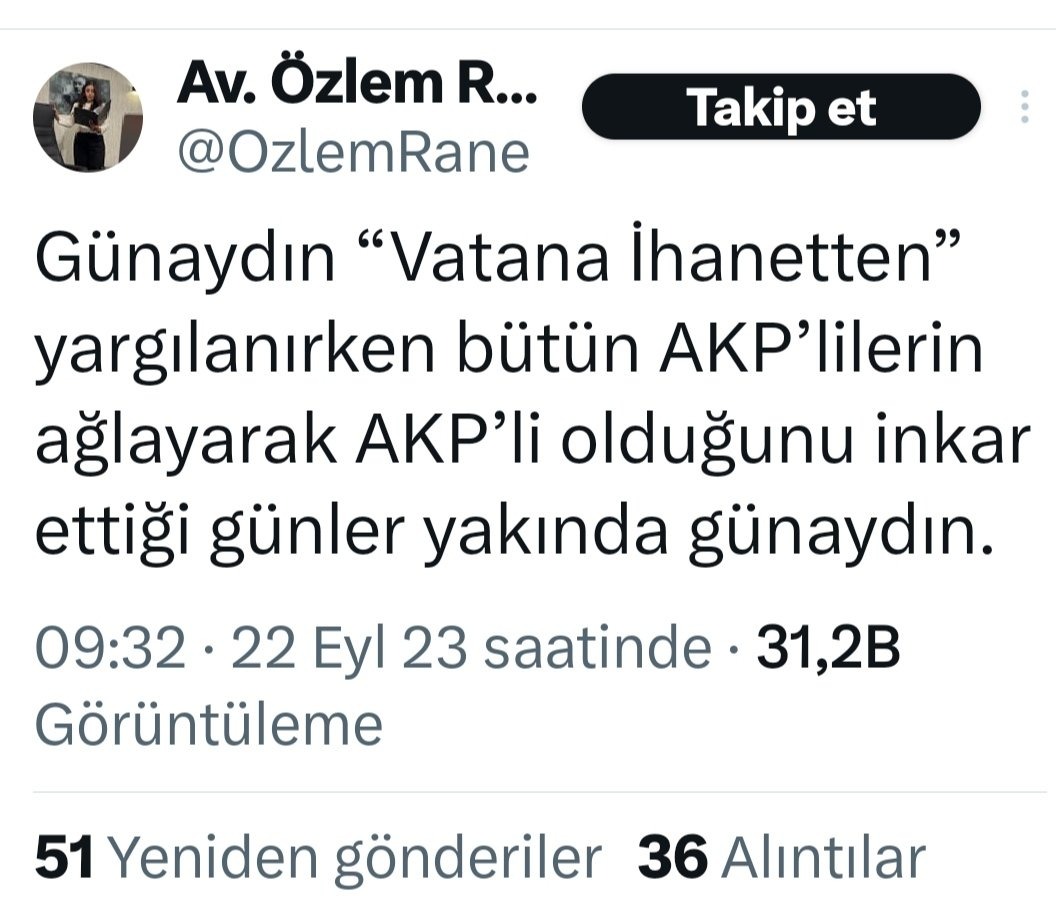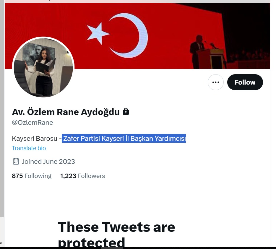 Gazete Pencere Haber MerkeziZafer Partisi Kayseri İl Başkan Yardımcısı Özlem Rane Aydoğdu, attığı bir tweet nedeniyle hedef oldu.Twitter (X) paylaşımında "Vatana ihanetten' yargılanırken bütün AKP'lilerin ağlayarak AKP'li olduğunu...