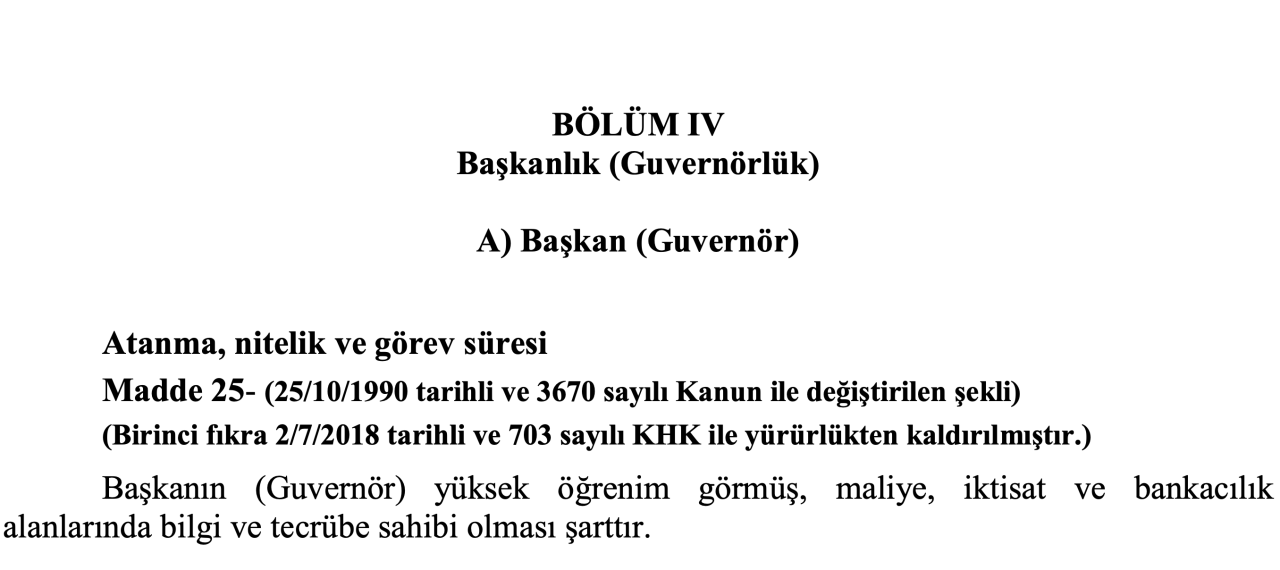 "Yeni Merkez Başkanı ataması yasaya uygun mu? Merkez Başkanı Hafize Gaye Erkan'ın özgeçmişi TCMB resmi web sitesinde yayımlandı. Yeni başkanın endüstri mühendisliği ve finans eğitimi aldığı ve bankacılık alanında bilgi ve tecrübesi olduğu görülüyor. Ancak Başkanın özgeçmişinde TCMB Kanunu'nun 25. maddesinde yer alan ve atama için zorunlu şartlar arasında yer alan iktisat ve maliye alanlarında bilgi ve tecrübe sahibi olmak konusunda bilg yer almıyor. Sorumu tekrarlıyorum: Atama TCMB Kanunu'nun 25. maddesine uygun mu?"