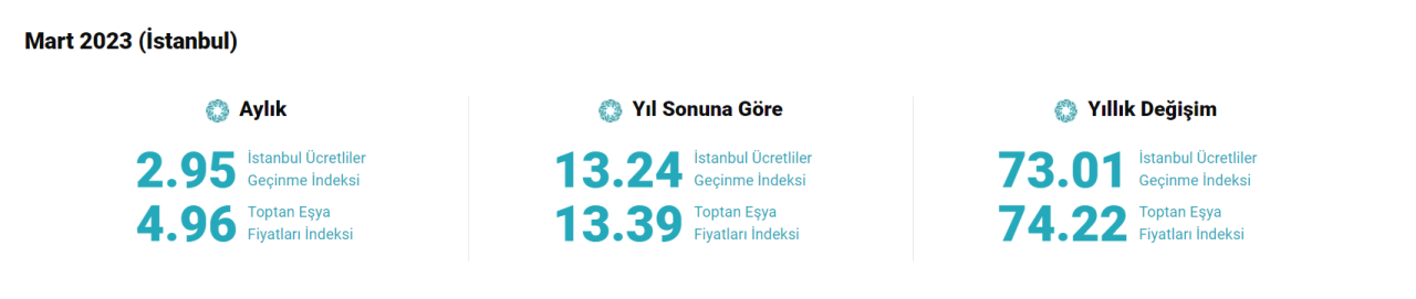 2022 Mart ayına göre 2023 Mart ayında yaşanan fiyat değişimlerini gösteren bir önceki yılın aynı ayına göre değişim oranı İstanbul Ticaret Odası’nın (İTO) 1995 bazlı Ücretliler Geçinme İndeksinde yüzde 73,02, Toptan Eşya Fiyatları İndeksinde ise yüzde 74,22 olarak gerçekleşti.