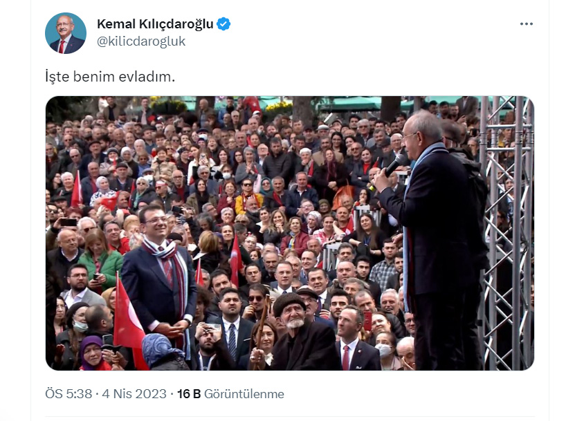 Kemal Kılıçdaroğlu, Trabzon'daki "Millet Buluşması"nın ardından sosyal medya hesabından paylaşım yaptı. Ekrem İmamoğlu ve kendisinin olduğu fotoğrafı paylaşan Kılıçdaroğlu, fotoğraf notuna "İşte benim evladım" yazdı.