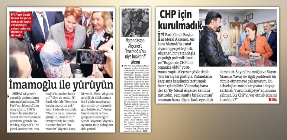 Sözcü’nün “İmamoğlu ile yürüyün” haberinde de Akşener’in vatandaşla tartışmasından hiç söz edilmiyor; tam tersine fotoğraf üzerinde “Akşener, Ankaralı kadın vatandaşın yakınmalarını dikkatle dinledi” bilgisi veriliyordu. Sözcü’nün, bu haberdeki eksiği ertesi gün “Akşener, İmamoğlu ve Yavaş sorusuna kızdı” haberiyle gidermesi de dikkat çekiciydi.