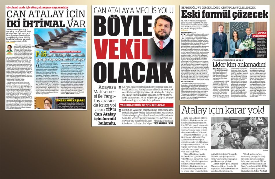 Tam da o günlerde Türkiye gazetesinde “Can Atalay'a Meclis yolu, böyle vekil olacak!” haberi çıktı. Haber, “AK Parti ve Adalet Bakanlığı orta yol formülü arıyor” diye başlıyor; Atalay’ın vekilliğinin TBMM’de düşürülmesinden sonra AYM’nin bu kararı kaldırabileceği, TBMM’nin de AYM kararına dayanarak Atalay’ın milletvekilliğini iade edebileceği belirtiliyordu. “Bu formül, AK Parti kulislerinde ve Adalet Bakanlığı tarafından dillendiriliyor. Parti kurmayları ve bakanlık hukukçuları ‘Bu yol izlenirse, her iki yüksek yargı organı arasındaki kriz de son bulur’ görüşünü dile getiriyor’ deniyordu.
