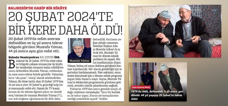 Habere göre, Balıkesir’in Adalı köyü yakınlarındaki ormanlık alanda 20 Şubat 1979’de bir ceset bulunmuş. Köy korucusu ve ormancılar, cesedin köyde yalnız yaşayan Mustafa Yılmaz’a ait olduğunu teşhis etmişler. O gün toprağa verilen Mustafa Yılmaz, 3 yıl kadar sonra köye geri gelmiş ve 44 yıl daha yaşadıktan sonra 20 Şubat 2024’te ölmüş!