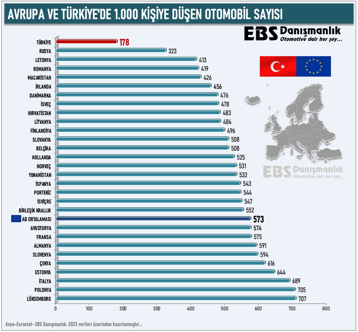 2023 yılında Türkiye’de rekor otomobil satışı yapılmasına rağmen, 1000 kişiye düşen otomobil sayısında halen Avrupa sonuncusuyuz. Türkiye’de her 1000 kişiye sadece 178 otomobil düşerken, Avrupa ortalaması 573, bizimle aynı nüfusa sahip Almanya’da ise 591.